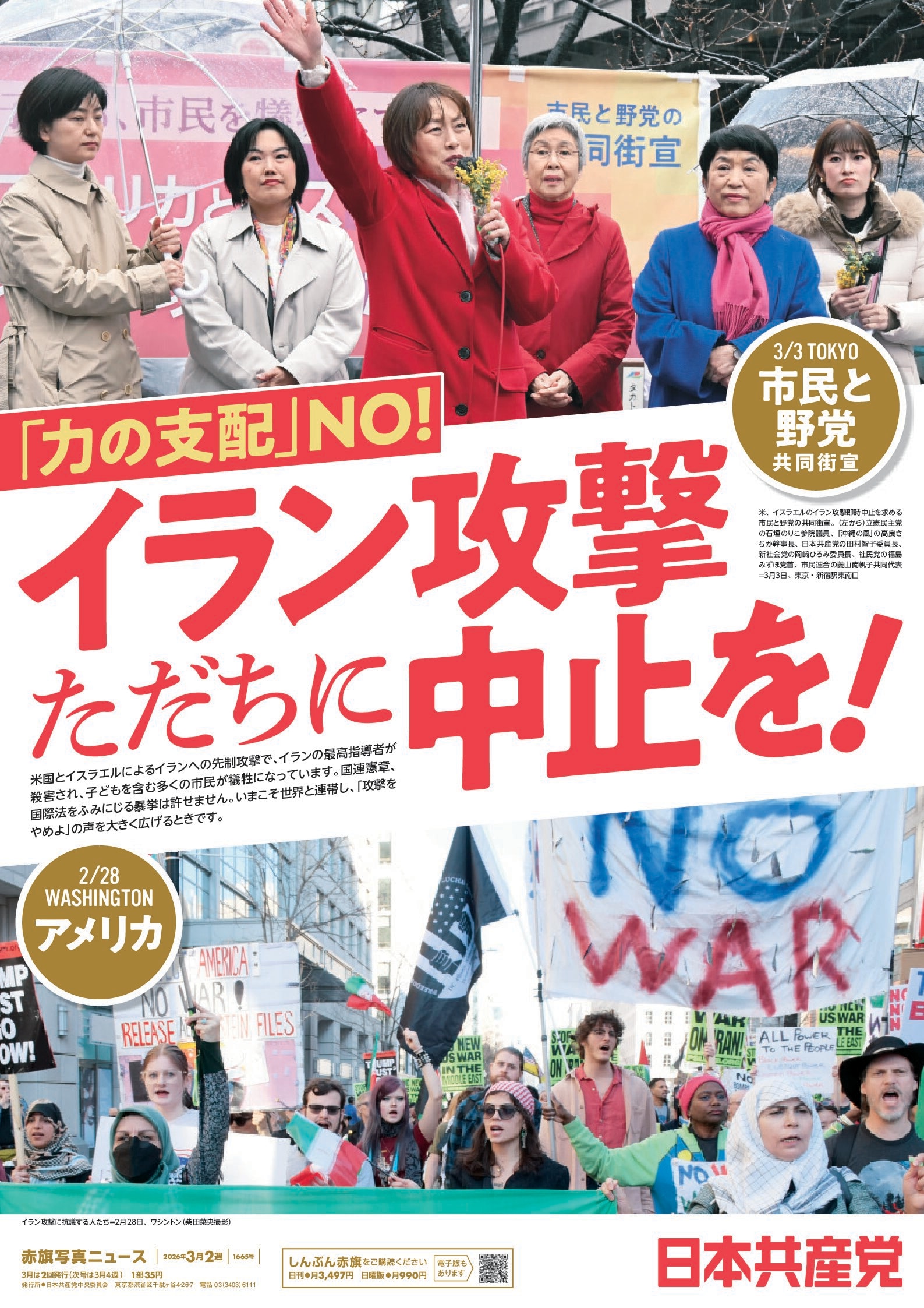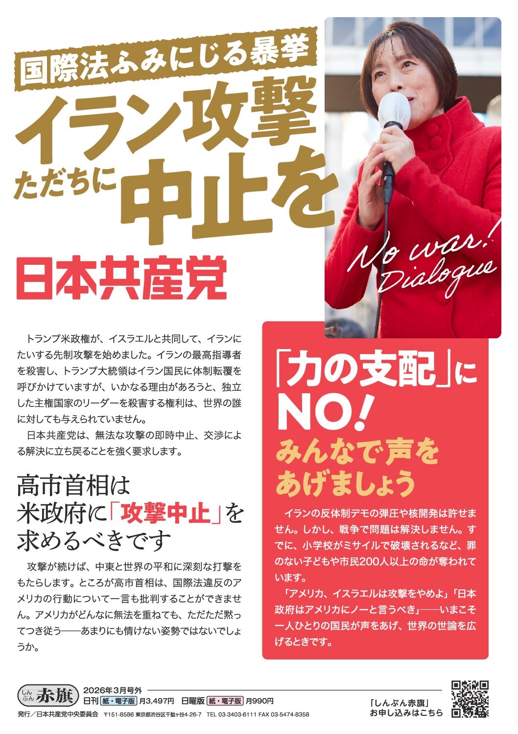 党の方針 綱領 規約 第29回党大会 党大会・中央委員会総会 会議 第8回中央委員会総会(2026年03月13日) 田村智子委員長が常任幹部会の訴え(動画と全文)(2026年02月17日) 第7回中央委員会総会・オンライン総選挙勝利全国総決起集会(2026年01月22日) 田村委員長の幹部会報告 第7回中央委員会総会 総選挙勝利・全国決起集会(2026年01月22日) 2026年党旗びらき 田村委員長のあいさつ(2026年01月05日) 幹部会決議 「集中期間」を4月末まで延長し目標をやりとげよう(2025年12月25日) 会議一覧へ 学習コンテンツ 『資本論』がいよいよ生命力を発揮する時代がやってきた 202... 【77分で『資本論』がよくわかる】日本共産党・志位和夫議長... 労働者階級の成長・発展を主軸にして、社会変革の展望をとら... 日本共産党創立103周年記念講演会 2025.9.23 いま『資本論』がおもしろい マルクスとともに 現代と未来を... 2025年SNS講座(2025年4月改訂版) 「人間の自由」と社会主義・共産主義 『資本論』を導きに シンポジウム 東アジアでの平和の準備をin福岡 建設労働者が誇りもち働ける日本を/建設労働者のつどいで... #田村智子 委員長の日本共産党Q&A 2024.12.20 2026新春対談 いまこそマルクス 志位和夫議長×マルチェロ・ムスト教授 Q&A『資本論』がおもしろい(赤本) 党創立103周年記念講演会 「?」におこたえします Q&A共産主義と自由(青本) 東アジアの平和構築への提言――ASEANと協力して 志位議長の講演 日本共産党第29回大会 「日本共産党の百年」 その他の学習コンテンツ 宣伝グッズ 日本共産党が作成した宣伝物です。ダウンロードをしてお使いいただけます。 赤旗写真ニュース 署名 ビラ・フライヤー 声のダウンロード 署名 ビラ・フライヤー ポスター プラスター 政策・提言全文 赤旗写真ニュース バナー・ロゴ パンフ 声のダウンロード 資料 シェア用素材 JCPウインドブレーカー・のぼり旗・掲示板 「しんぶん赤旗」PR 雑誌・書籍 党出版局、新日本出版社の本はお近くの書店でお申し込みいただけます。最寄りの日本共産党事務所でも扱っています。 ご注文について 新日本出版社 前衛 女性のひろば 月刊学習 議会と自治体 経済 パンフレット・書籍 一覧 いまこそマルクス 事務所 全国の事務所 機構と人事、財政 中央委員会の機構と人事 政治資金収支報告